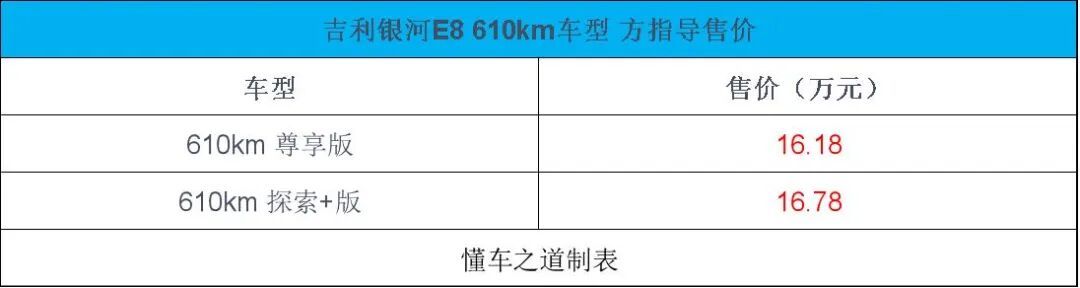 9月11日,我们从官方获悉,吉利银河E8加推2款610km长续航车型,售价分别为16.18万元和16.78万元。新车搭载67.8kWh宁德时代电池,拥有610km续航,配备千里浩瀚安全辅助智驾系统or基础辅助驾驶。不仅如此,车内拥有45英寸显示屏,配备银河Flyme Auto智能座舱系统以及23扬声器Flyme Sound无界之声音响等。动力来看,此次610km长续航版搭载67.8kWh宁德时代电池,拥有610km续航。