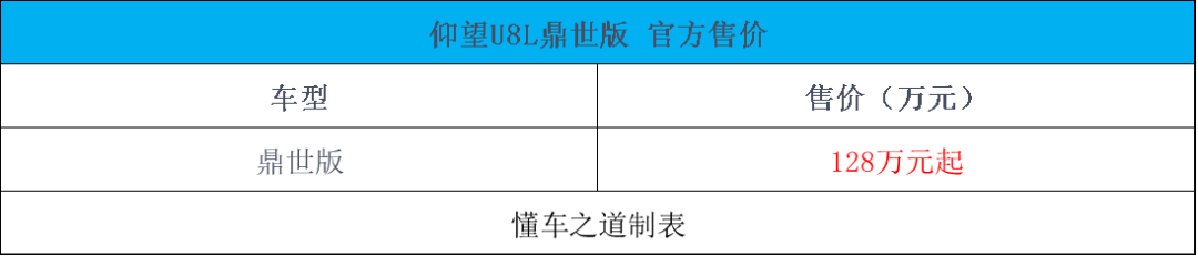 9月12日,仰望U8L鼎世版正式上市,新车共计推出1款车型,售价128万元起,新车将于9月底开启交付。仰望U8L鼎世版定位大型SUV,在原仰望U8基础上进行加长,同时产品风格也进行了调整,细节进行优化,鼎世版车型轴距增加200mm,可选装24K黄金车标。