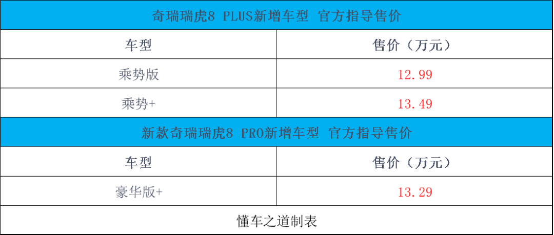 9月10日,奇瑞官方宣布,旗下新款奇瑞瑞虎8 PRO豪华版+上市,售价13.29万元,奇瑞瑞虎8 PLUS乘势版/乘势版+正式上市,售价分别为12.99万元与13.49万元。两款新车在外观细节、内饰配置等方面有小幅调整和优化。