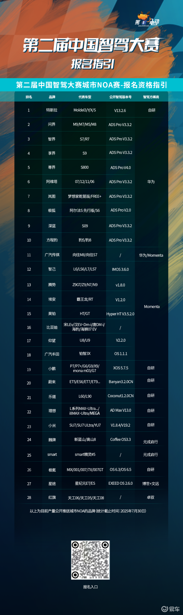 不完全统计,截至7月30日,具备比赛报名资格的整车品牌已达28个,参见比赛报名指引。底部有报名通道,扫码即可。浙江的智驾车友们,来吧,热起来!