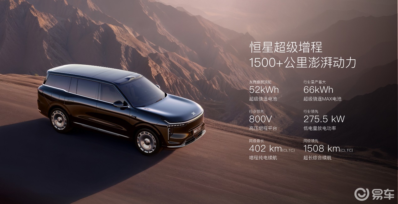动力系统上,智己LS9搭载1.5T增程器与电动机组成的“恒星超级增程”混动系统。其中1.5T发动机最大功率114kW,系统综合最大功率390kW,零百加速时间为4.9秒。52 Ultra版配备52kW·h磷酸铁锂电池,CLTC纯电续航320km;66 Ultra版配备宁德时代66kW·h超级骁遥MAX三元锂电池,CLTC纯电续航402km,综合续航里程分别为1454km和1508km。车辆采用800V架构,支持快速充电,10%-80%充电时间分别为19分钟和16.5分钟。