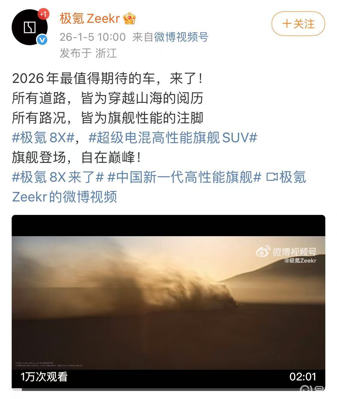 1月5日,极氪品牌官方正式宣布旗下全新SUV命名为“极氪8X”。据悉,极氪8X基于浩瀚-S豪华电混专属架构打造,具备运动化设计取向。结合当前的宣发节奏来看,极氪8X预计将于近期迎来首发亮相。