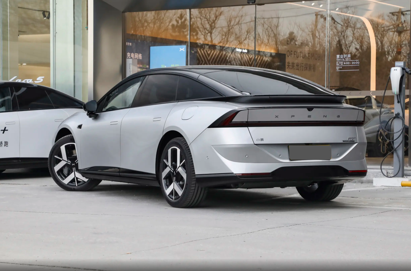 全新样式的轮毂很醒目,同时也能够为其带来一定的辨识度,而且新款小鹏P7+全系标配19英寸轮胎,对比老款尺寸会更大。车身尾部同样会营造出悬浮式车顶的既视感,例如从后挡风玻璃的根部延伸出来的扰流板,再搭配上下方翘起的小鸭翼造型,还可以营造出双层尾翼的既视感,进一步提升了整车的运动氛围。而且也不难发现,新款小鹏P7+换上了全新设计的一体式星轨贯穿尾灯,同时也给到辅助驾驶小蓝灯提示功能,整个灯组点亮之后的效果也确实比老款车型更显时尚感和科技感。