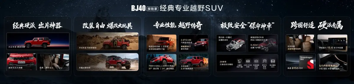 总结:从产品层面看,BJ40探险家在15万级价格区间内,集成了电控分时四驱、三把锁、快拆硬顶、AT胎、采埃孚8AT变速箱等专业越野配置,同时在舒适性、智能化与安全性方面实现系统化提升,试图打破传统硬派越野“重性能、轻舒适”的固有认知。