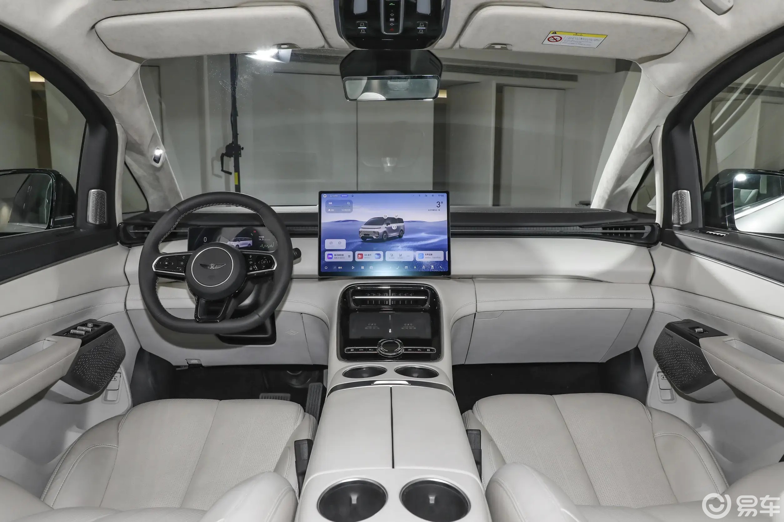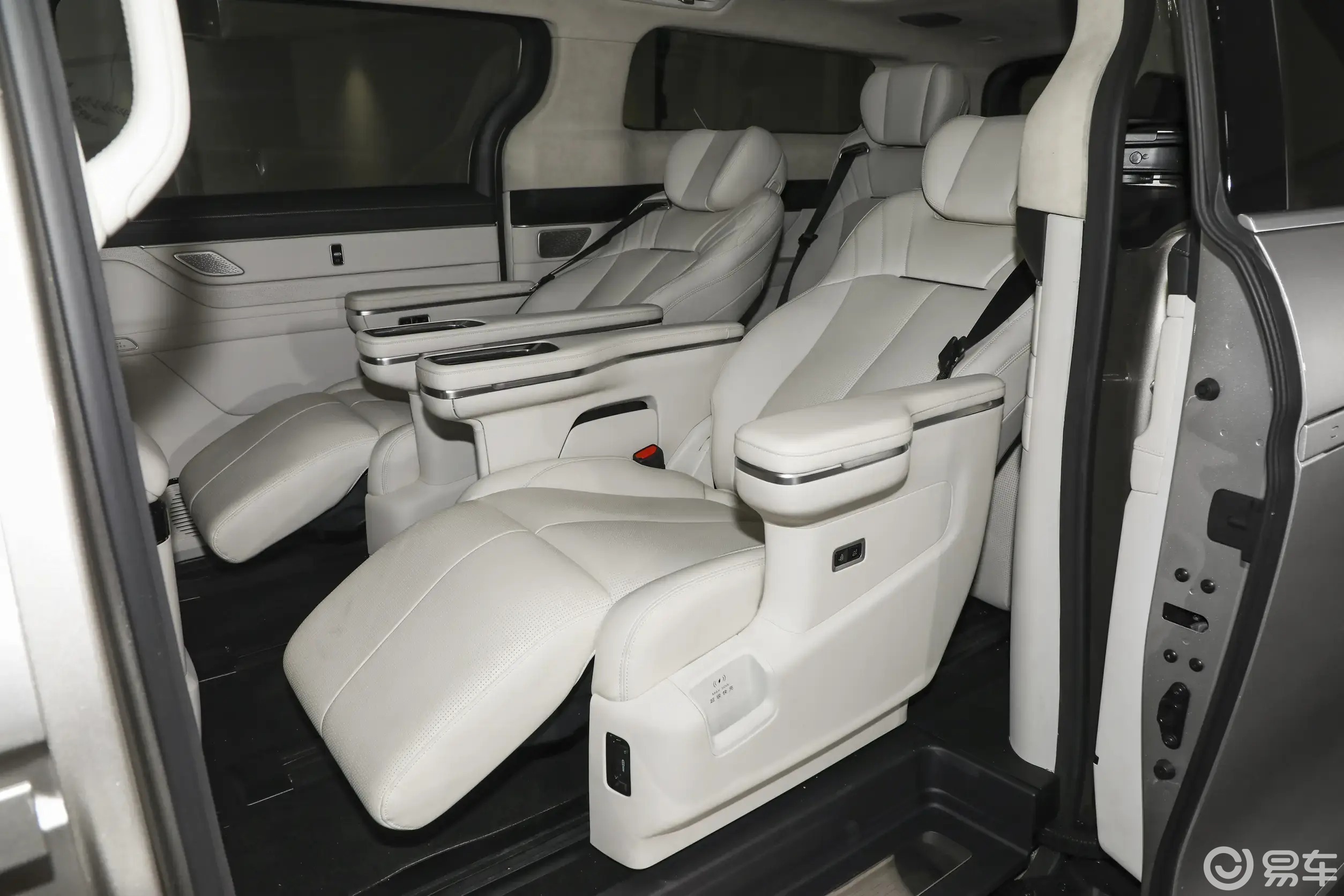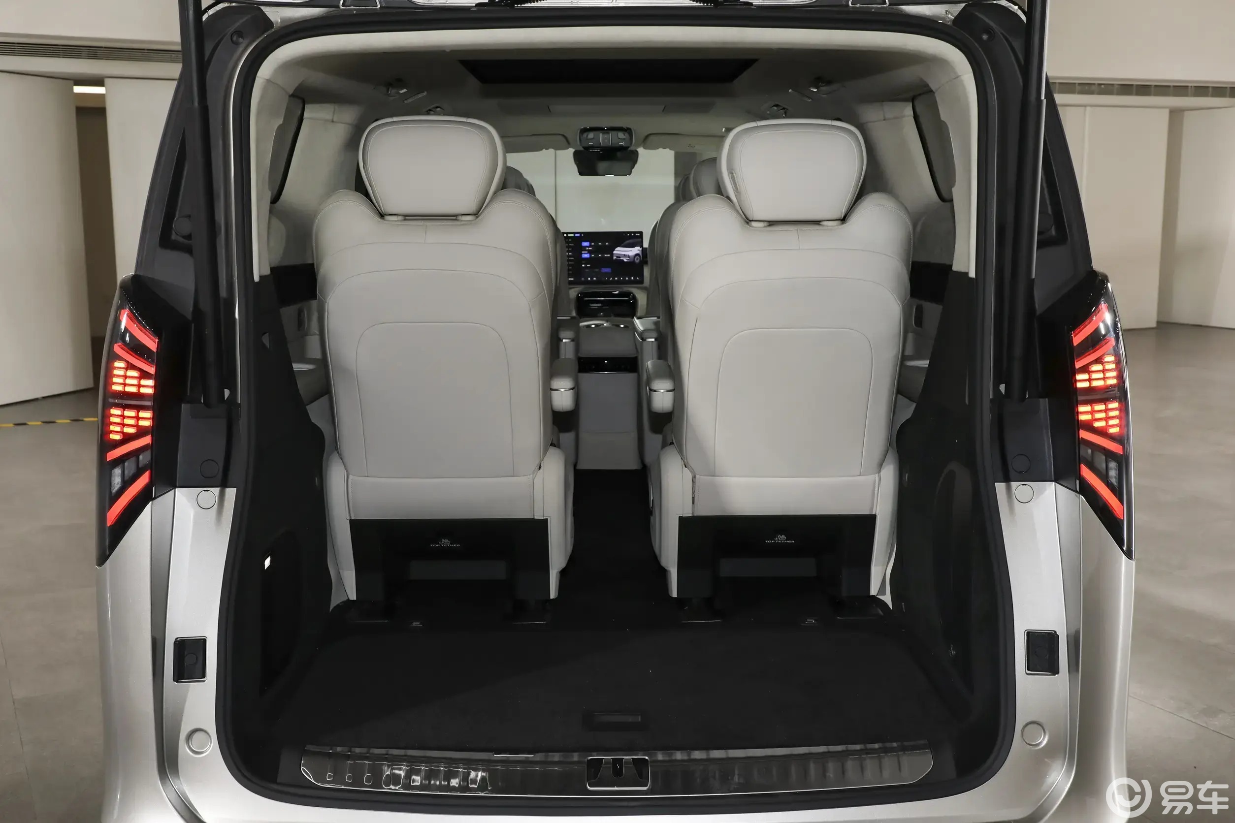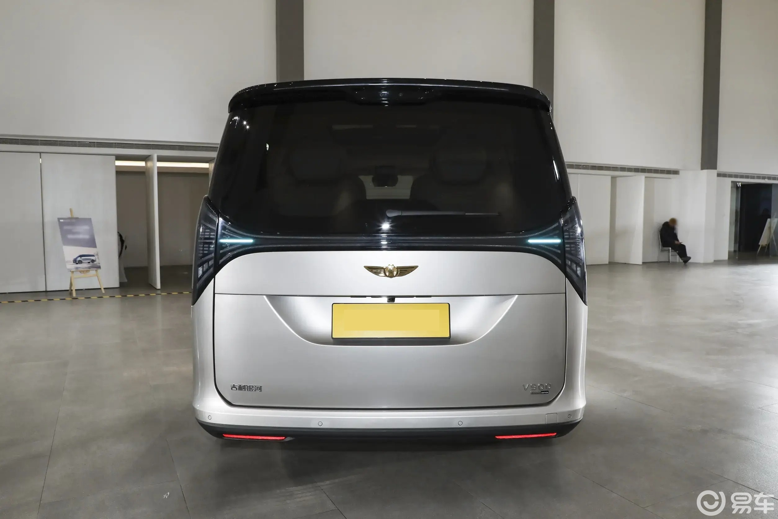 其实这车最唬人的是个头。长宽高分别是5360/1998/1940毫米,轴距达到了3200毫米。这种尺寸走在路上,气场这块儿没得说。而且侧面用了黑色车顶的双色设计,配上隐藏式门把手和侧踏板,精致感还是在线的。至于车尾,还是熟悉的配方,只不过尾门中间换成了银河的图形标,右下角写着V900来亮明身份。