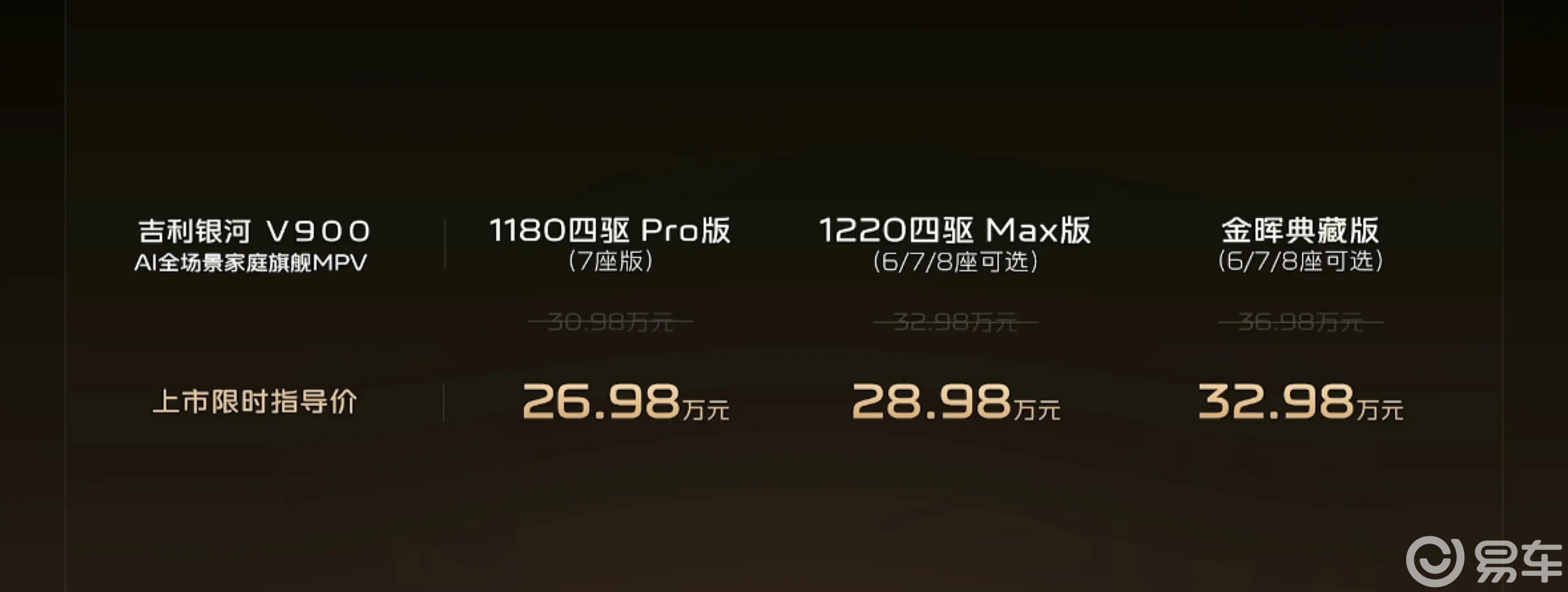 大家好,我是大李。说实话,看到吉利银河V900正式上市的消息,我的第一反应是:这车看着怎么这么眼熟?仔细一看,好家伙,这不是翼真L380吗?玩笑归玩笑,这两款车的区别还是很大的。此次银河V900正式上市共推出3款车型,指导价区间定在30.98万到36.98万元,限时优惠的价格直接拉到了26.98万到32.98万元。这个价格放在一台车长超过5米3的中大型MPV上,确实有点狠,甚至让我怀疑,吉利这是要直接去抢合资燃油MPV的市场啊!