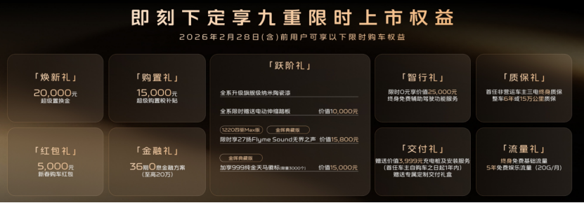 除了价格惊喜,吉利银河还推出了包含焕新礼、购置礼、流量礼等在内的“九重购车好礼”。针对前3000名提车用户(金晖典藏版),官方还特别赠送10克纯金礼遇,进一步提升了用户的尊贵感。