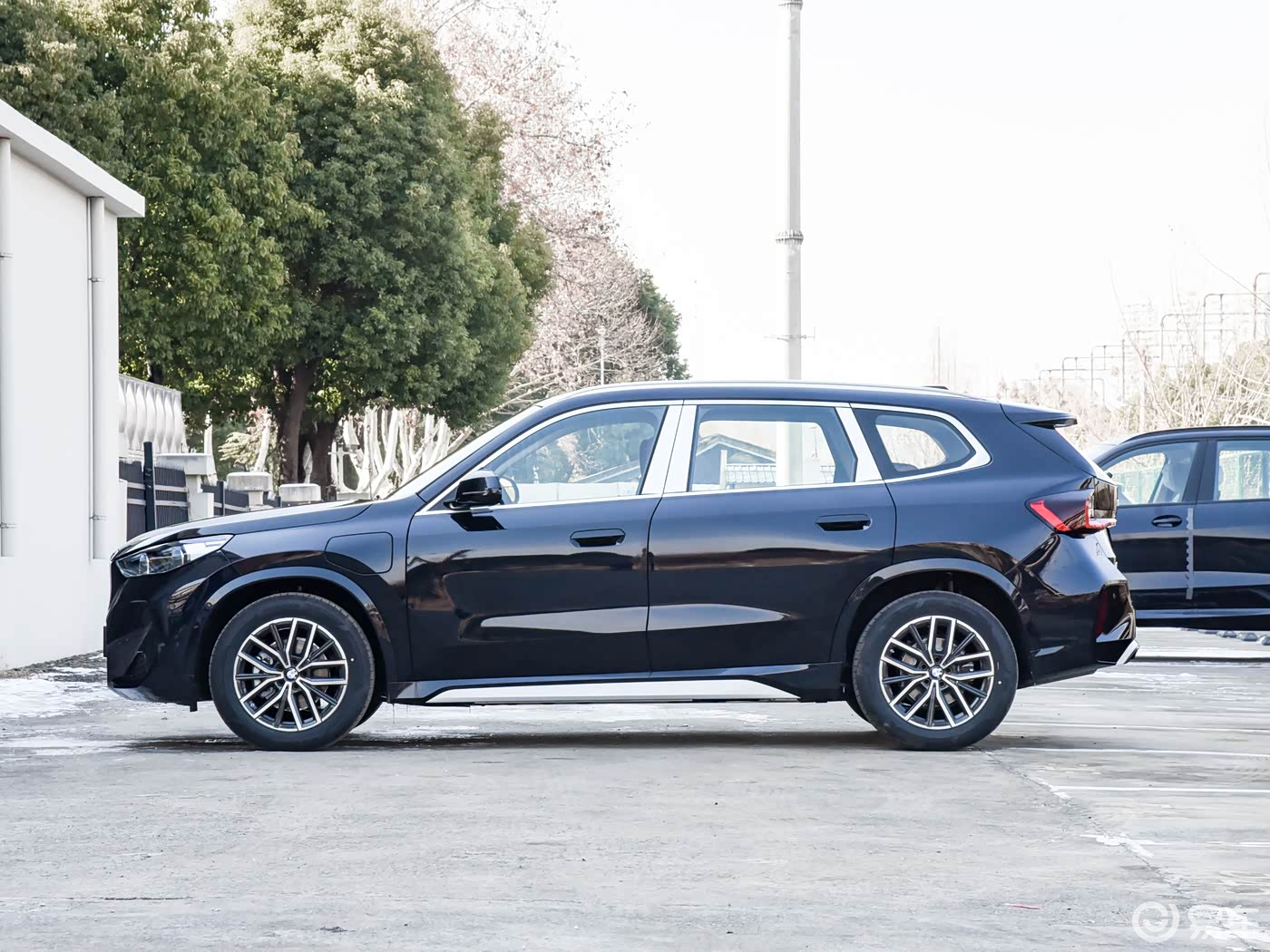 侧面部分,新款宝马iX1的车身结构比较紧凑,车顶略带一点弧度,粗壮的行李架也没有缺席,贯穿式腰线从前翼子板一直延伸至车尾,搭配轮眉和侧裙部分隆起的筋线,点缀出车身侧面的层次感和肌肉感。此外,新车还配备了半隐藏式门把手,下方则配备了五辐式造型轮毂,风格比较大气。