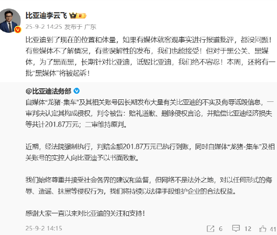9月2日,比亚迪法务部在微博发布公告称,自媒体“龙猪-集车”及其相关账号因长期发布大量有关比亚迪的不实及侮辱诋毁信息,一审判决认定其构成侵权,判令被告:赔礼道歉、删除侵权言论,并赔偿比亚迪经济损失等共计201.87万元;二审维持原判。