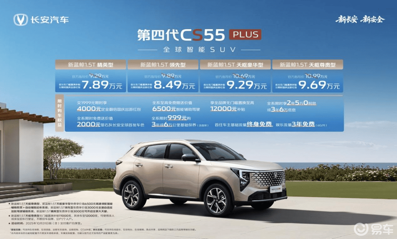 第四代CS55PLUS此次发布的四款车型,叠加无门槛置换补贴及限时国庆出游红包后的优惠价格分别为:新蓝鲸1.5T精英型7.89万元;新蓝鲸1.5T领先型8.49万元;新蓝鲸1.5T天枢豪华型9.29万元;新蓝鲸天枢尊贵型9.69万元。