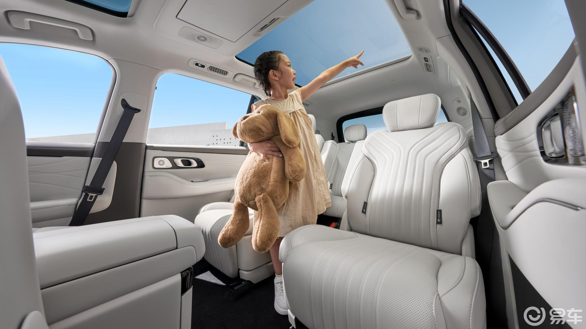 先看座位布局:银河 M9是2+2+2六座,这可不是简单多两个座位,而是解决了家庭出行的“核心痛点”。日常通勤时,第三排可以放倒,秒变“大五座”,后备厢能塞下婴儿车 + 购物袋;周末带老人孩子出门,6个座位刚好坐下“一家三代”,第二排独立座椅带扶手,老人坐久了不腰酸,孩子在中间过道走动也方便;要是长途自驾,第三排坐两个成年人也不挤 —— 它的短前悬长轴距设计,硬是挤出了5.2㎡同级最大车内面积,得房率高达88.3%,第三排腿部空间够舒展,不是“应急小板凳”。