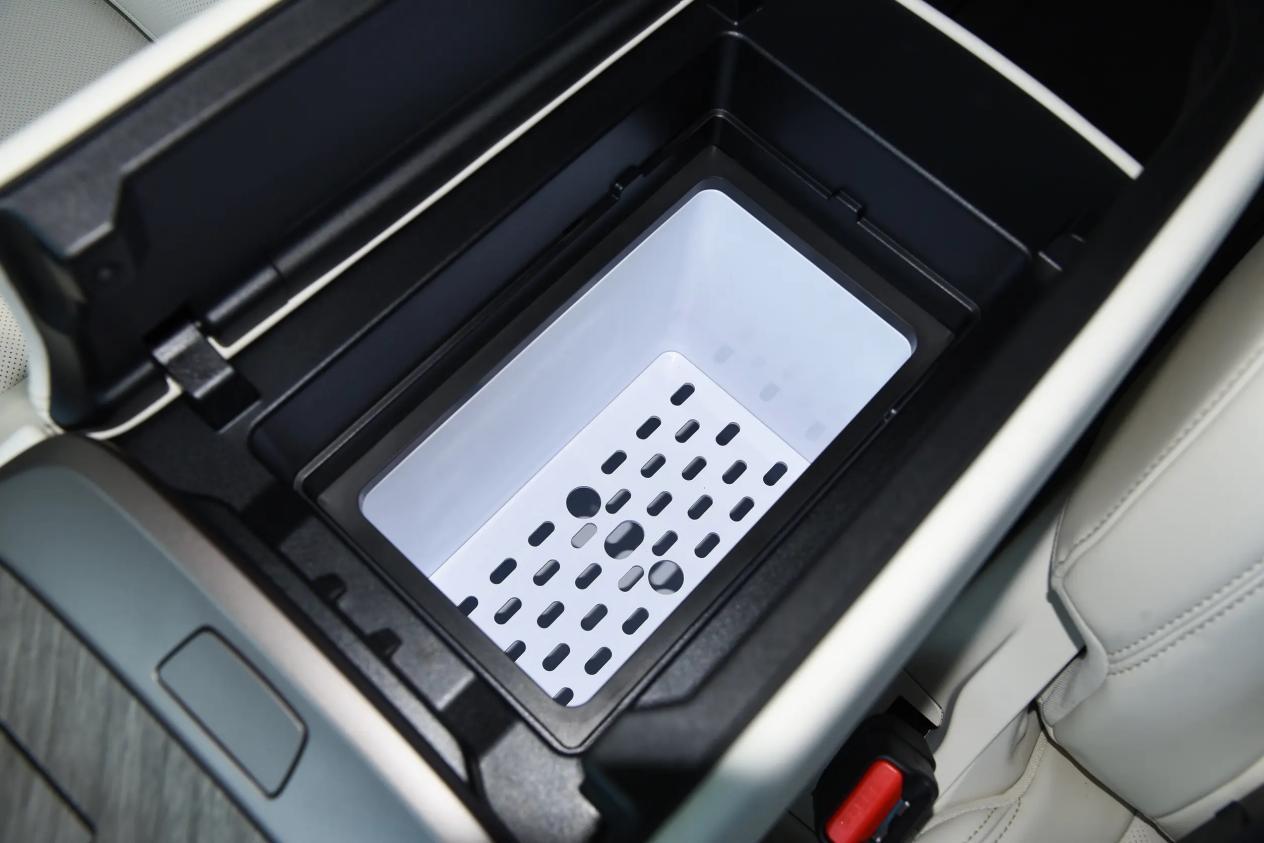 车内标配23个扬声器的音响系统,峰值功率2440W,支持杜比全景声和5D观影模式,配合主动式环境氛围灯,可提供沉浸式的视听体验。此外,12.5L智能冷暖冰箱也是标配,采用双层置物、双门双开设计,支持0-50°C三档调温,方便前后排乘客随时取用饮品。冰箱上层可放置6瓶水,下层可放置10瓶可乐,满足全车每人至少两瓶饮品需求,充分考虑到了家庭出行的实际需要。