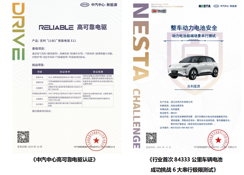 吉利星愿搭载行业首款11合1智能电驱,在功能高度集成的同时,还拥有同级领先的89.2%电驱效率,实现了同级最小的66L体积,将节省的空间以超大后备箱的形式还给了用户。通过了3000小时的台架耐久和200万公里的真实路试,星愿电驱完成了浸水工作、高温耐久、电磁抗扰、扭矩冲击、机械冲击等7大高难度挑战,获得了中汽研《高可靠电驱》的认证。