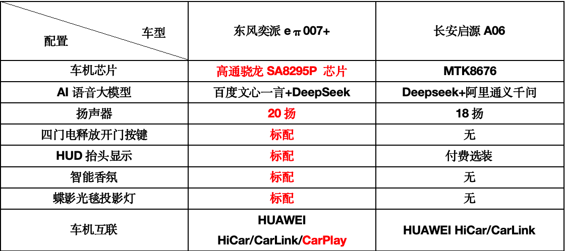 此外,东风奕派eπ007+还配置了主流的三大手车互联,覆盖苹果、华为、安卓等手机用户,手机互联很便捷;而长安启源A06缺席了苹果CarPlay,对年轻用户需求的把控不够精准。
