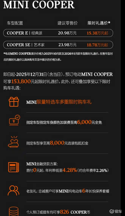 12月17日,2026款电动MINI COOPER正式上市,共推COOPER E经典派、COOPER SE艺术家两款配置。价格方面,新车建议零售价20.98-23.98万元,即日起至2025年12月31日,限时礼遇价低至15.38-18.78万元,还可叠加多重福利:指定车型车身颜色加装费至高全免6000元、享至高8000元选装包抵扣金;金融方案支持首付0元起,年利率低至4.28%(约合年费率2.26%),忠诚客户更有6年长悦保养套餐,个人预订/提车可获826 COOPER币。