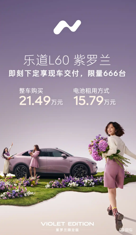 12月18日,乐道品牌官方宣布乐道L60紫罗兰版正式上市,整车售价21.49万元,可选BaaS电池租用方案,售价低至15.79万元,新车限量666台并同步开启交付。即日起至12月31日,锁单全系乐道L60至高立省4.1万元,可享0首付3年0息、5年免费NOA领航辅助等权益,登录乐道App还能参与1.1亿购车礼遇,试驾可赢取NIOPhone等好礼,紫罗兰版更享购置税至高减免9509元。