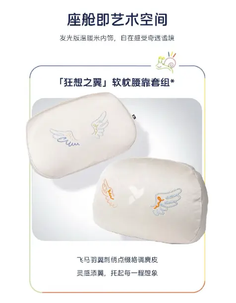 内饰方面,萤火虫天马狂想曲特别版延续了品牌一贯的米色温暖基调,麂皮材质与外观相呼应。细节处的设计尤为考究:从羽翼刺绣的“狂想之翼”软枕腰靠套,到地毯上的天马元素图案,每一处都蕴含精致工艺。值得一提的是,此特别版配备了艺术家亲笔签名标识,并提供独一无二的NFC卡片钥匙与配套彩绘家充桩。