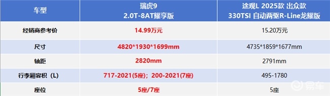 作为合资中型SUV的主流选手,途观L轴距尚可,但4733*1839*1673mm的车身整体尺寸中规中矩,车内空间对高大乘客不够友好,头部和腿部会略显局促。后备厢最大拓展容积1780L,仅能满足基础装载需求。全系仅提供5座布局,逢年过节全家出行时,难以满足大家庭多人同乘的出游需求。