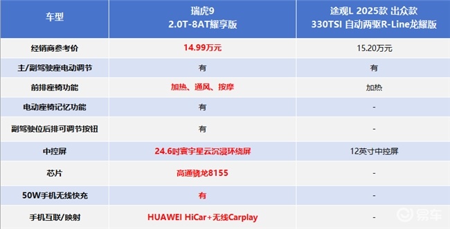 以同样的标准来盘点,途观L的舒适配置和智能化表现仍有一定的提升空间。前排座椅加热、自动空调等基础配置齐全,但缺少50W无线充电、座椅通风按摩及二排座椅调节功能,老人孩子长时间乘车易感到不适,舒适性与便利性均有欠缺。智能化方面,12英寸中控屏虽支持语音交互,但未搭载主流芯片,也不支持双区域语音唤醒,可能无法满足家庭出行的多元交互需求。