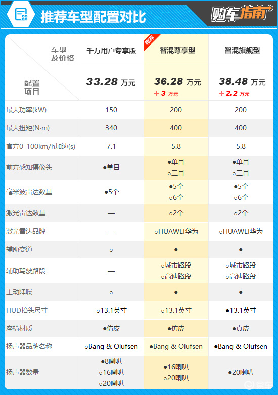 指导价为36.28万元的智混尊享型是本次的推荐车型。通过配置对比可以看出,推荐车型相比低一级别车型,换装了2.0T高功率发动机,零百加速仅需5.8秒,动力表现更加出色。推荐车型还可选装华为乾崑智驾(后续提供,另行通知),拥有2个激光雷达,使其具备城市和高速双路段辅助驾驶能力,更贴合当下消费者的用车需求。此外,推荐车型还增加了辅助变道、主动降噪以及16喇叭Bang & Olufsen扬声器,用车体验进一步提升。虽然售价相比低一级别车型高出3万元,但在动力表现、新增配置以及后期选装潜力方面,均体现出与差价相匹配的价值。