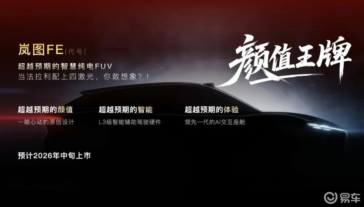 岚图全新纯电FUV代号岚图FE,将于2026年中旬上市。