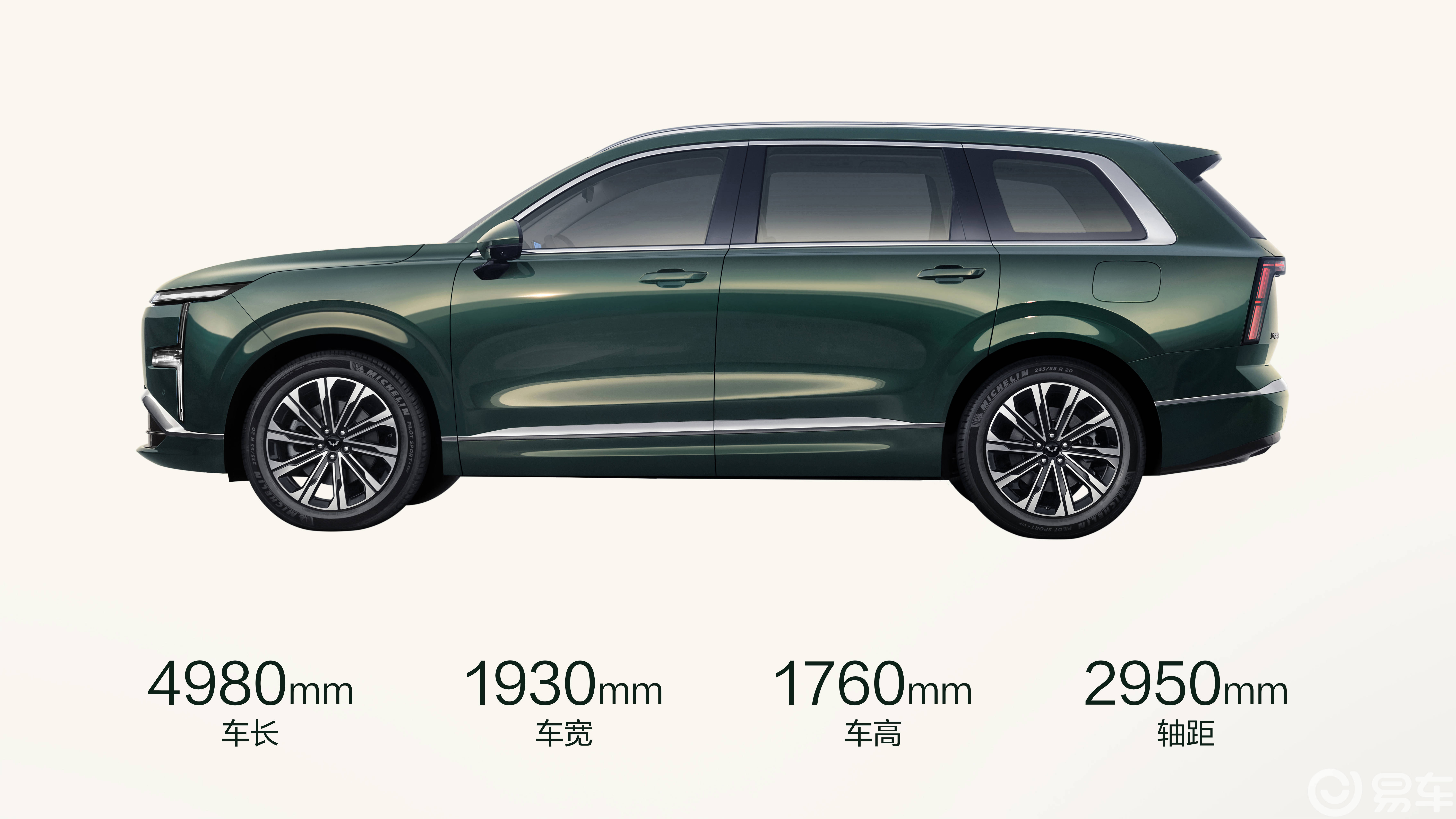 新车提供苍松绿、沁湖蓝、墨竹黑、山岩银、晨霜白五款车色。长宽高分别为4980mm×1930mm×1760mm,轴距2950mm,为2+2+2六座布局的中型SUV车型。